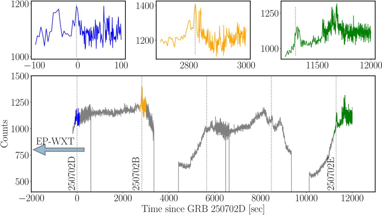Figure 1. The Fermi-GBM (8 keV –900 keV energy range; observer frame) count-rate light curve spanning from −2 × 103 to 1.2 × 104 s after the GRB 250702D trigger (main panel, gray lines; with data from each burst highlighted in color), along with zoom ins around the time of the individual triggers (upper row). EP-WXT observations revealed an X-ray counterpart a day earlier (blue arrow; H. Q. Cheng et al. 2025), indicating transient high-energy emission preceding the GBM trigger. The dashed vertical lines indicate periods of 2825 s (the measured gap between GRB 250702D and GRB 250702B).