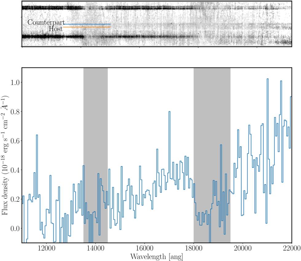 Figure 3. X-shooter spectroscopy in 2D (top) and 1D (bottom) of the counterpart of GRB 250702B obtained on 2025 July 4, rebinned in the 1D to 50 Å per bin. Signal is only recovered in the infrared arm (shown) at low signal to noise. The gray bands indicate regions of high telluric absorption that are not corrected for. The source shows brightening through the H and K regions of the spectrum consistent with photometry. Given the low signal to noise no significant absorption or emission features are visible in the counterpart spectrum. The slit was also oriented to cover the location of the host galaxy, but no redshift could be derived.