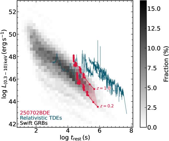 Figure 4. Comparison of the X-ray light curve of GRB 250702B with those of Swift GRBs (grayscale background) and relativistic TDE candidates, downloaded from the Swift Burst Analyser (P. A. Evans et al. 2007, 2009, 2010) and the Living Swift-XRT Point Source Catalogue (P. A. Evans et al. 2023) and processed as described in S. Schulze et al. (2014). At any reasonable redshift the luminosity of the event is comparable to those of GRBs, and GRB 250702B is clearly faster and less luminous than the relativistic TDE candidates. This would be consistent with a lower-mass black hole involved in a disruption, or with a more normal GRB interpretation.