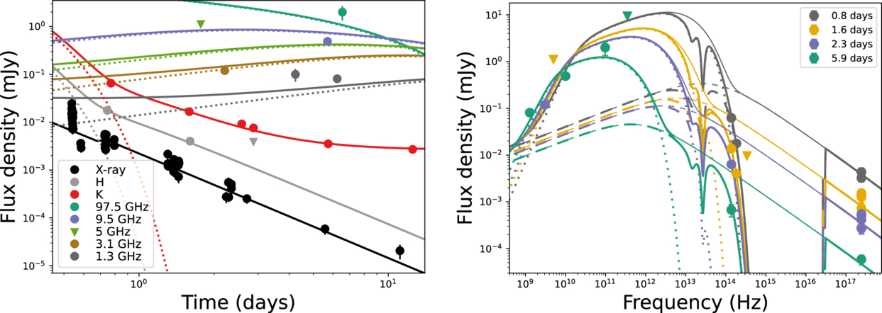 Figure 5. Light curves (left) and spectral energy distributions (right) for the afterglow of GRB 250702B spanning from ≈0.5 to 20 days at radio to X-ray wavelengths. The observations can be well explained by a standard synchrotron model comprising radiation (solid lines) from forward (dashed) and reverse (dotted) shocks at z ≈ 0.16 and high host attenuation, AV ≈ 12 mag (see Section 5 for details and Appendix A for model parameters).