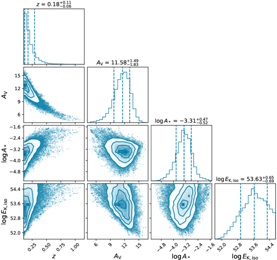 Figure 6. Correlation plots and marginalized posterior density functions for four key free parameters in the afterglow model (Section 5 and Appendix A), demonstrating that low-redshift z ≲ 0.3 and high-extinction (AV ≳ 10 mag) models are favored by the data under the modeling constraints employed here.