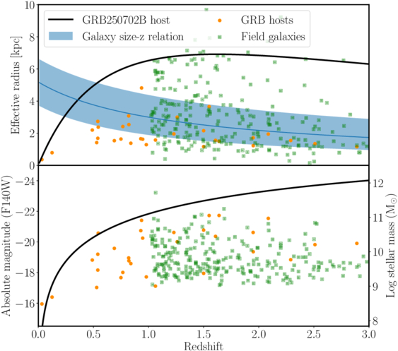 Figure 7. The effective radius (top) and absolute magnitude of the host galaxy of GRB 250702B at various redshifts from 0.1 < z < 3. The top panel shows how the physical radius would evolve across the redshift range (black line), while the shaded blue region is the galaxy size–redshift relation from K. Ormerod et al. (2024), and the green points a set of direct measurements of high-z (z > 1) galaxy sizes (and masses) from the Hubble Frontier Fields (L. Yang et al. 2021). The GRB host population from J. D. Lyman et al. (2017) is also shown. The lower panel shows the absolute magnitude of the host galaxy in the F140W filter, as well as a crude conversion to stellar mass. Both the sizes and luminosities of the host of GRB 250702B would be consistent with the GRB host and field galaxy population at low z, matching particularly well at z < 0.5. At higher redshift large, luminous galaxies do occur, but as the intrinsic luminosity of the GRB 250702B host increases with redshift, they become increasingly rare. The host would be unusually luminous beyond z ∼ 1.