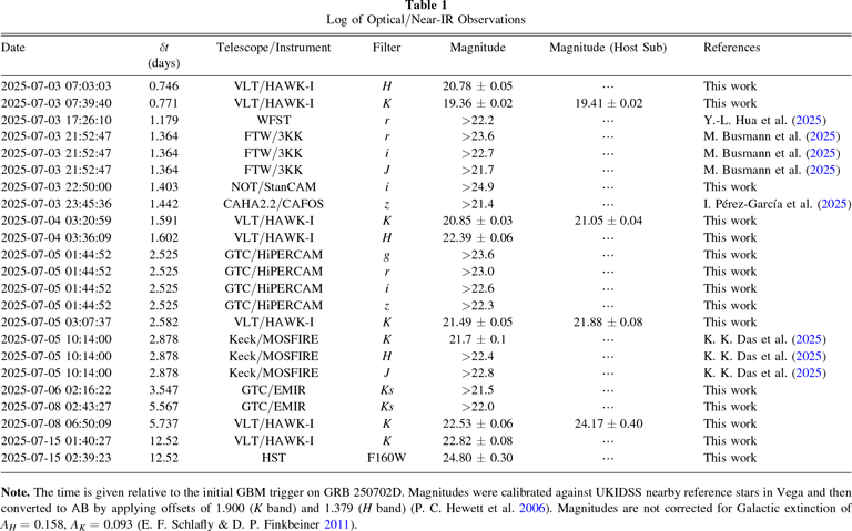 Note. The time is given relative to the initial GBM trigger on GRB 250702D. Magnitudes were calibrated against UKIDSS nearby reference stars in Vega and then converted to AB by applying offsets of 1.900 (K band) and 1.379 (H band) (P. C. Hewett et al. 2006). Magnitudes are not corrected for Galactic extinction of AH = 0.158, AK = 0.093 (E. F. Schlafly & D. P. Finkbeiner 2011).