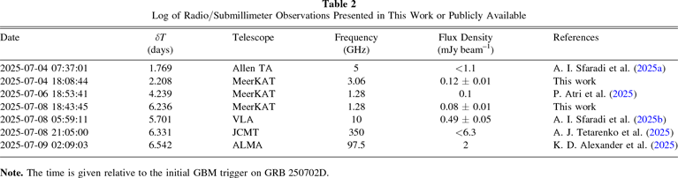 We observed GRB 250702B with the MeerKAT radio telescope (F. Camilo et al. 2018; J. Jonas 2018) under program SCI-20241101-FC-01 (PI: Carotenuto) beginning on 2025 July 4 at 17:37:32 UT (δt = 2.208 days) at the S band (S4; central frequency 3.06 GHz and 875 MHz bandwidth), followed by a second observation on 2025 July 8 at 18:43:45 UT (δt = 6.236 days) at the L band (central frequency 1.28 GHz and 856 MHz bandwidth). We utilize PKS J1939–6342 as bandpass and flux density calibrator and J1822–096 and J1908–201 as complex gain calibrators at 3.06 and 1.28 GHz, respectively, obtaining a total on-source time of 42 minutes in each band. We reduce the data with the OxKAT pipeline (I. Heywood 2020), which performs standard flagging, calibration, and imaging using tricolour (B. V. Hugo et al. 2025), CASA (CASA Team et al. 2022), and WSCLEAN (A. R. Offringa et al. 2014), respectively. For imaging, we adopt a Briggs weighting scheme with a −0.3 robustness parameter for both frequencies, which yielded a beam of 109 × 27 and rms noise of 9 μJy beam−1 at 3.06 GHz, and 81 × 64 and 13 μJy beam−1 at 1.28 GHz. We clearly detect the radio counterpart of GRB 250702B at the position of the optical counterpart at both frequencies (first reported in A. J. Bright et al. 2025). We fit for a point source in the image plane and report our results in Table 2. We additionally compile publicly reported millimeter and radio observations from MeerKAT, the Atacama Large Millimeter Array (ALMA; K. D. Alexander et al. 2025), the James Clark Maxwell Telescope (JCMT; A. J. Tetarenko et al. 2025), the Allen Telescope Array (Allen TA; A. I. Sfaradi et al. 2025b), and the Karl G. Jansky Very Large Array (VLA; A. I. Sfaradi et al. 2025b) in Table 2.